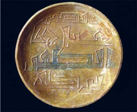 Keramik med støbt eller stemplet dekoration i relief, inspireret af romerske eller sasanidiske metalarbejder, kendes allerede fra den umayyadiske periode. Dette flade fad, med sin markante, arabiske indskrift i kufi-