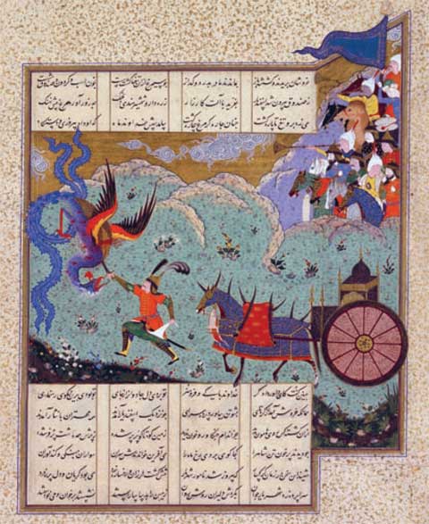 For at kunne dræbe den frygtelige Simurgh fremstiller helten Isfandiyar en stridsvogn oversået med klinger. Efter at fuglen har såret sig selv ved utallige angreb, springer den persiske helt ud af vognen og fælder sin farverige modstander.