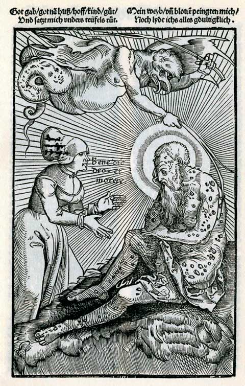 Satan slår Job med ondartede bylder fra isse til hæl, Jobs bog 2,9. Jobs hustru ser til. Træsnit i Hans von Gersdorff: Feldbuch der Wundarznei, Strassburg 1517. Medicinsk Museion, København