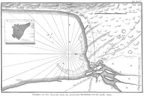 Kortet er blot ét af Carsten Niebuhrs tre kort over Det Røde Hav. Stedet for overgangen var stærkt diskuteret. Carsten Niebuhr selv mener, at overgangen med størst sandsynlighed fandt sted ved Suez. Bogstavet E viser det sted, hvor Niebuhr selv krydsede Det Røde Hav.