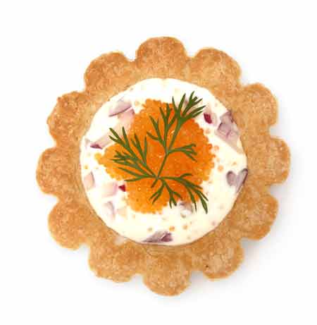 Tartelet med stenbiderrogn, cremefraiche og rødløg