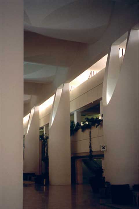 Indgangshallen rejser sig højt op som parlamentets monumentale ansigt udefter. To rækker smukt formede søjler, hvoraf de forreste er de højeste, bærer et svajende tag der er sat sammen af halvcirkulære trug. Fra denne åbne konstruktion går det videre ind i selve ”parlamentsbyen” gennem et hovedstrøg, som vækker minder om bazaren i Isfahan i dimensioner og belysningsforhold, men som her fremtræder i en nutidig udformning og detaljering.