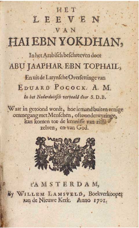 Det er tydeligt nok ibn Tufayl og Historien om Hayy ibn Yaqzan, der er tale om her. Simon Ockley’s engelske udgave var kommet i 1708 og blev optrykt flere gange i det tidlige attende århundrede. Det var den første oversættelse til engelsk efter den arabiske tekst, som den store Oxford-