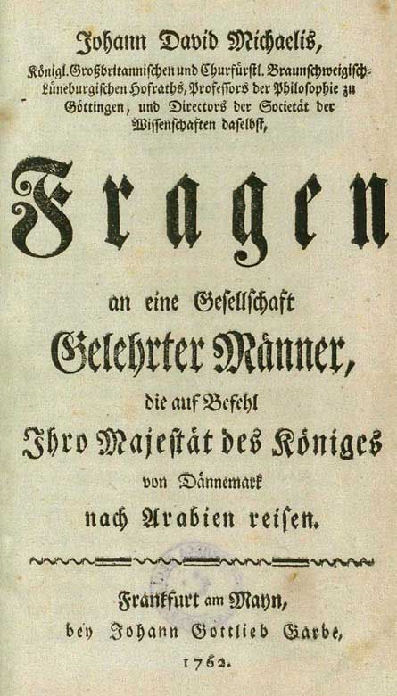 Professor Johann David Michaelis ved universitetet i Göttingen var den oprindelige idémand bag Den arabiske Rejse. I en lille bog, der nåede rejseselskabet i Alexandria i 1762, formulerede han i hundrede spørgsmål ekspeditionens opgaver. Spørgsmålene blev stillet efter en rundspørge blandt lærde i hele Europa. De var omhyggeligt forklaret og underopdelt – selv mente Michaelis, at han stillede mere end tusinde underspørgsmål, og i bogens forord skrev han bl.a.:
