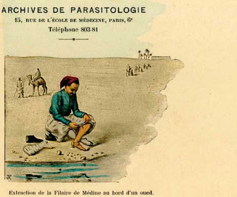 En mand trækker en Guineaorm ud af sit ben ved at rulle ormen om en pind. Vignet i tidsskriftet Archives de Parasitologie, Paris ca.1920. Medicinsk Museion, København