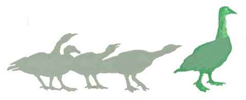 De malede ”skygger” eller silhuetter beskriver på en fabulerende og frit malet måde dyrenes ageren som overnaturlige væsener med hensigter og menneskelignende personlighed. ”Skyggerne” virker samtidigt som overraskende eller forskrækkende elementer, når et nyt blad vendes.