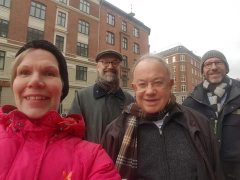 Turist i Europa. Professor Garbi Schmidt, ruc, guider Olivier Roy rundt på det muslimske Nørrebro den 21. februar 2018. I baggrunden bag skæg og briller: Søren Møller Christensen, Forlaget Vandkunsten, og Francois Barjot, Det franske Kulturinstitut. Selfie.